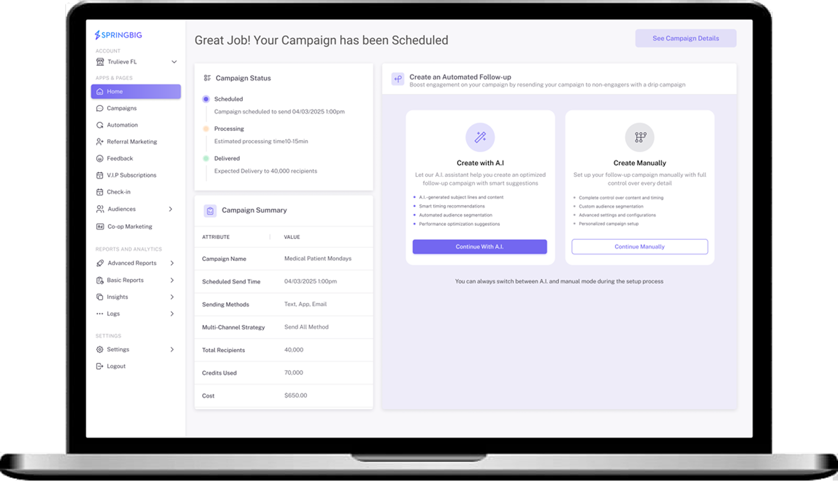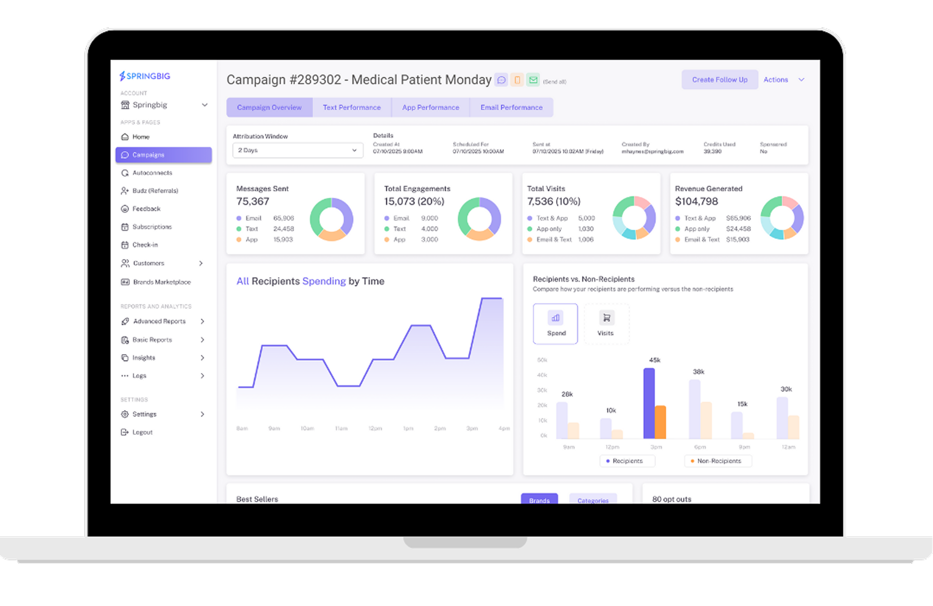 Stay connected with your customers through text, email, and push notifications—all from one platform. Whether it’s a one-time promotion or a drip campaign for effortless follow-ups, Springbig makes it simple to deliver the right message at the right time. Plus, with real-time reporting, you’ll know exactly what’s working so you can refine, repeat, and drive even greater results.