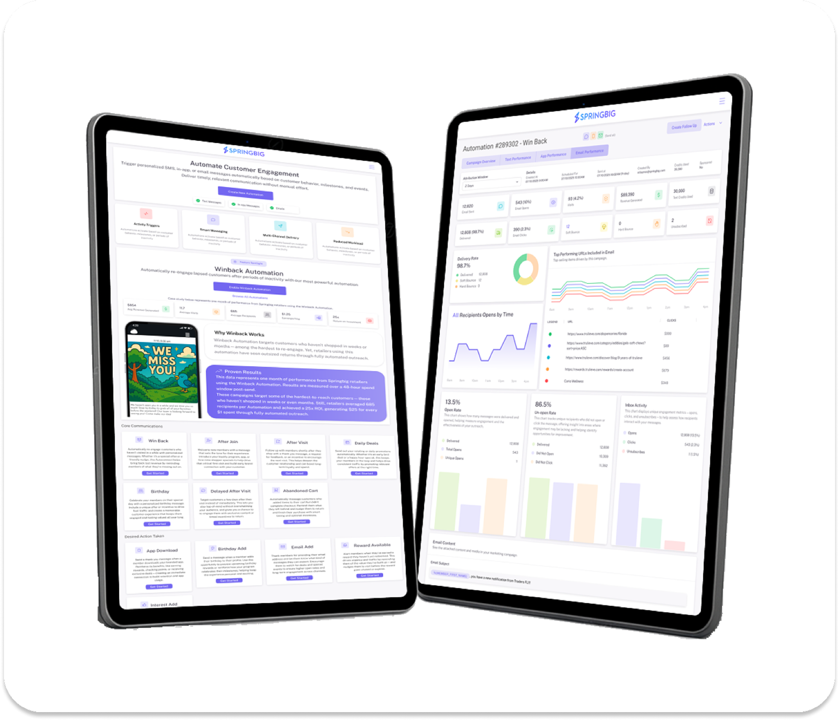 Keep customers engaged and coming back with automated campaigns that work in the background for you. From win-back offers that re-engage lapsed shoppers, to milestone messages that celebrate birthdays, anniversaries, and big spends, to rewards that recognize your top customers—Springbig automations make every interaction personal and profitable with SMS, push notifications, and email. Stop chasing one-off promos and start driving consistent sales and loyalty with hands-free marketing that never misses a moment.